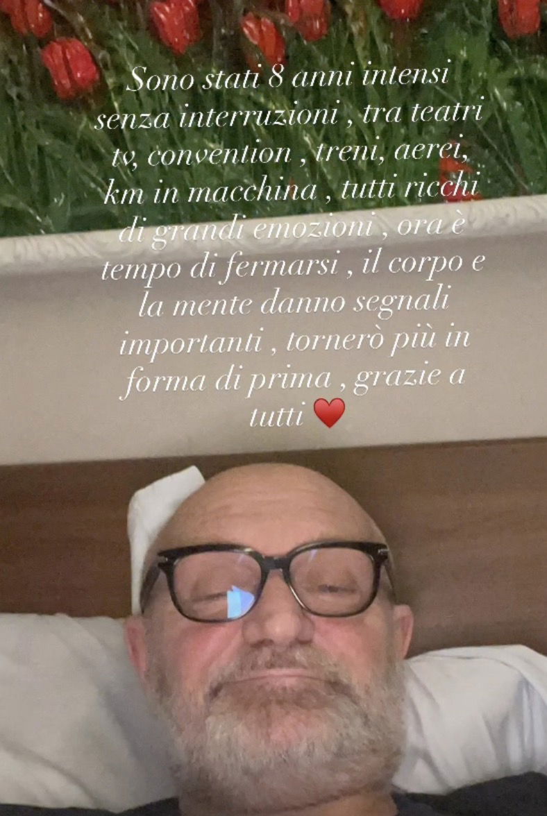 Nella stessa data del suo spettacolo 30 Anni e Non Sentirli, il conduttore ha annunciato che si prenderà una pausa, dopo ben otto anni consecutivi di lavoro tra teatri e televisione e infatti lo scorso 2 gennaio il 60enne ha scritto su Instagram: “Sono stati 8 anni intensi senza interruzioni, tra teatri, tv, convention, treni, aerei, km in macchina, tutti ricchi di grandi emozioni, ora è tempo di fermarsi, il corpo e la mente danno segnali importanti, tornerò più in forma di prima, grazie a tutti voi“.