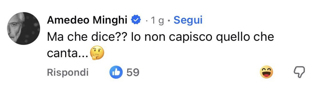 La frase «ma che dice, io non capisco quello che canta» non esprime una critica argomentata come uno si aspetterebbe da un grande artista come Amedeo Minghima semplicemente sminuisce l’artista insinuando che il canto sia confuso o incomprensibile. Insomma, non è un giudizio tecnico o costruttivo, ma un commento sprezzante. E da uno del calibro di lui, non me lo sarei mai aspettato. Per fortuna Annalisa vola alto, ha rispettato l’età non ha commentato.