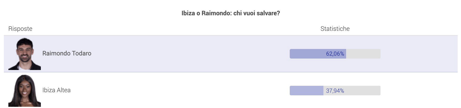 Chi di più tra Ibiza e Raimondo rischia? I sondaggi parlano chiaro. Stando alle preferenze su pagine social, siti e forum dedicati al Grande Fratello Vip, Raimondo Todaro può tirare un sospiro di sollievo. Il coreografo siciliano in tutti i sondaggi è il più votato con percentuali che vanno dal 53 al 62%.