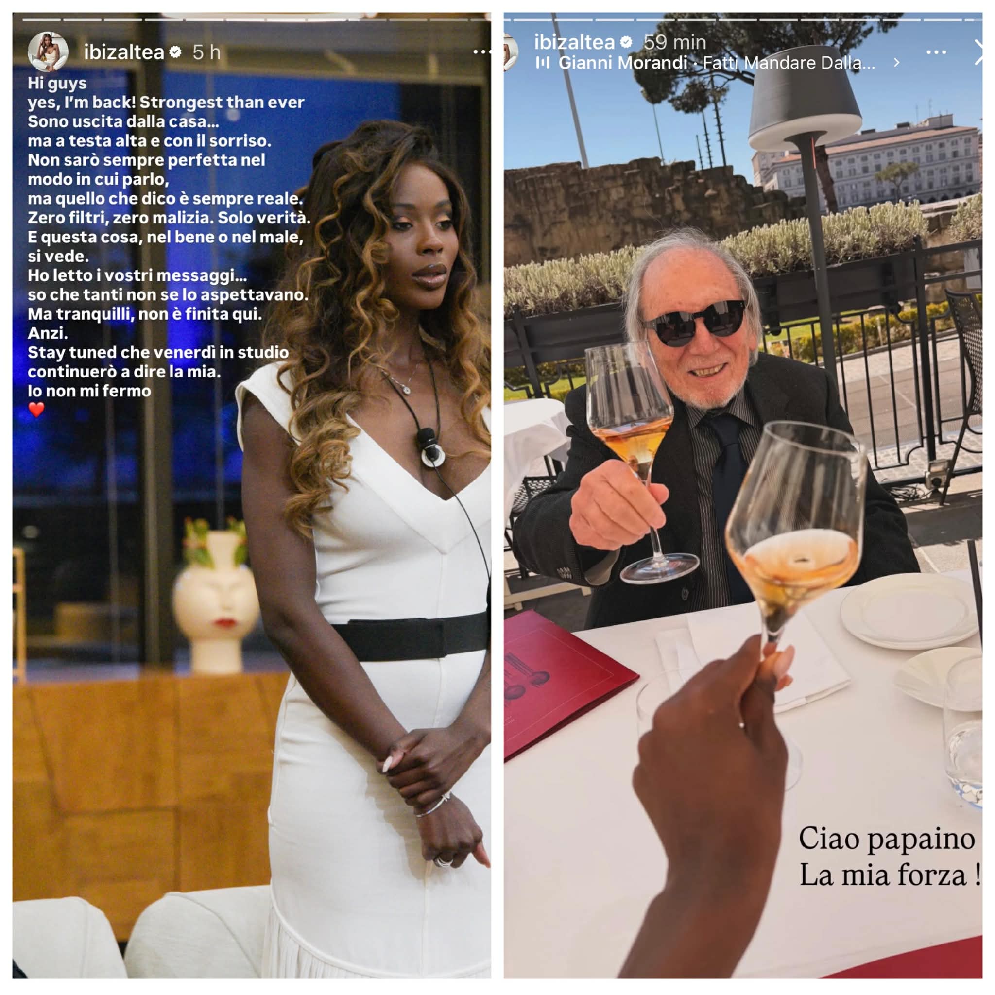Tornata su Instagram, Ibiza ha pubblicato una storia parlata in cui ha detto: “È strano essere tornata qua, ci vediamo di nuovo venerdì. Mi dispiace per come sono uscita, ma ora sono con lui. Mi mancano già alcuni ex concorrenti, però sono felice di essere arrivato fino a qua e aver dato sempre il mio punto di vista“, poi ha condiviso una storia scritta: “Ciao ragazzi sì, sono tornato! Più forte che mai. Sono uscita dalla casa ma a testa alta e con il sorriso. Non sarò sempre perfetta nel modo in cui parlo, ma quello che dico è sempre reale. Zero filtri, zero malizia. Solo verità. E questa cosa, nel bene o nel male, si vede. Ho letto i vostri messaggi… so che tanti non se lo aspettavano. Ma tranquilli, non è finita qui. Anzi. Stay tuned che venerdì in studio continuerò a dire la mia. Io non mi fermo” e infine ha pubblicato una foto di suo padre, rinominato la sua forza. Quest’ultimo non è propriamente uno qualsiasi: è Angelo Altea, ex deputato ed ex giornalista de L’Unione Sarda.