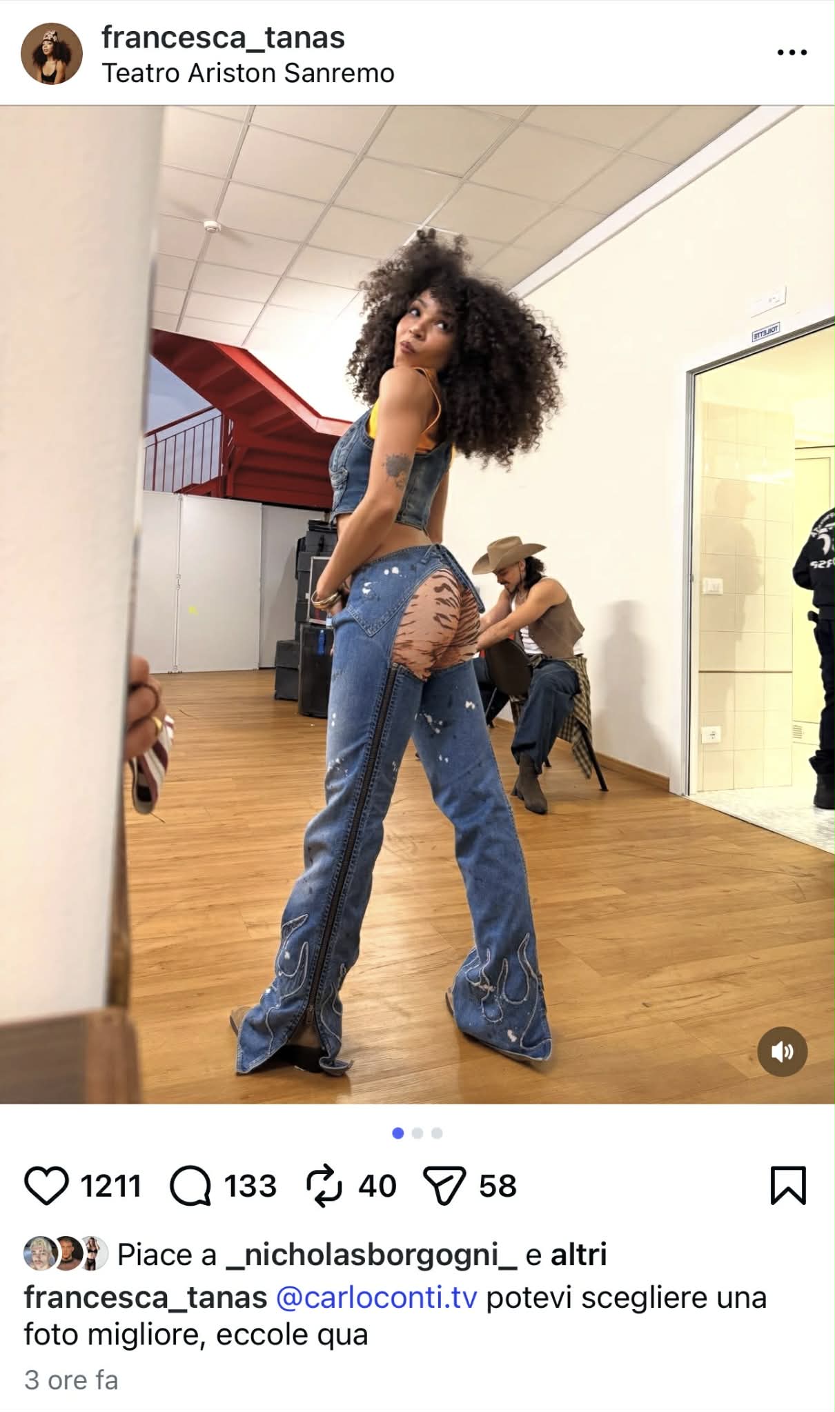 La ballerina in questione, Francesca Tanas, si è riconosciuta nella foto pubblicata da Carlo Conti su Instagram e gli ha risposto per le rime accusandolo di averla sessualizzata esclusivamente per un outfit lavorativo. “Ragazzi, che comunque a me non interessa minimamente perché non sono sorpresa, voglio dire Rai = feccia dell’umanità. Però ci tengo a puntualizzare che sto tizio qua di nome Carlo Conti mi ha letteralmente sessualizzata per dei pantaloni da show e come se non bastasse ha messo in imbarazzo la moglie palesando e minimizzando la gelosia e l’imposizione nel dirle cosa può indossare e cosa no. Riflettiamoci. Nel mentre mi auguro che le abbia chiesto scusa e magari se ci pensa qualche minuto in più che chiedesse scusa pure a me“.