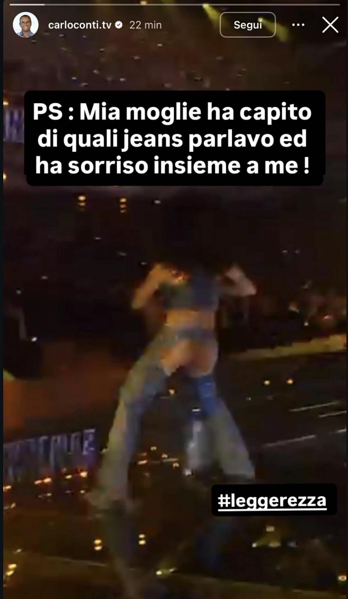 Quando qualcuno gli ha fatto notare che quella non è gelosia, ma controllo del corpo altrui, Carlo Conti ha risposto pubblicando su Instagram la foto della ballerina ripresa da dietro invitando tutti alla leggerezza. “PS: mia moglie ha capito di quali jeans parlavo e ha sorriso insieme a me! #Leggerezza“.