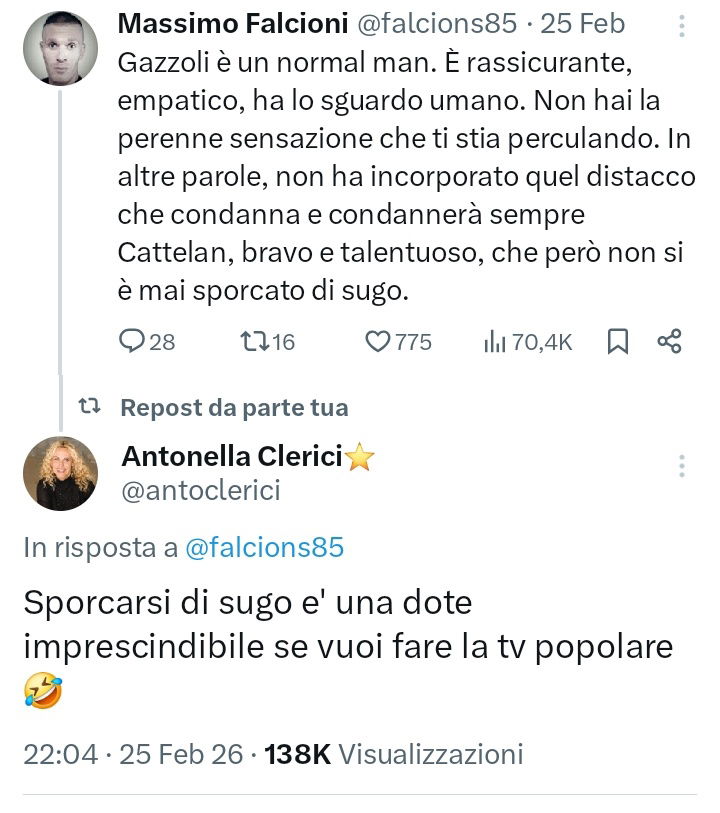 Lo ha fatto lo scorso 25 febbraio in risposta a Massimo Falcioni che, commentando Gianluca Gazzoli al Festival di Sanremoha scritto: “Gazzoli è un uomo normale, è rassicurante, empatico, ha lo sguardo umano. Non hai la perenne sensazione che ti sta perculando. In altre parole, non ha incorporato quel distacco che condanna e condannerà sempre Cattelan, bravo e talentuoso, che però non si è mai sporcato di sugo“. Rispondendo con: “Sporcarsi di sugo è una dote imprescindibile se si vuole fare la tv popolare“.