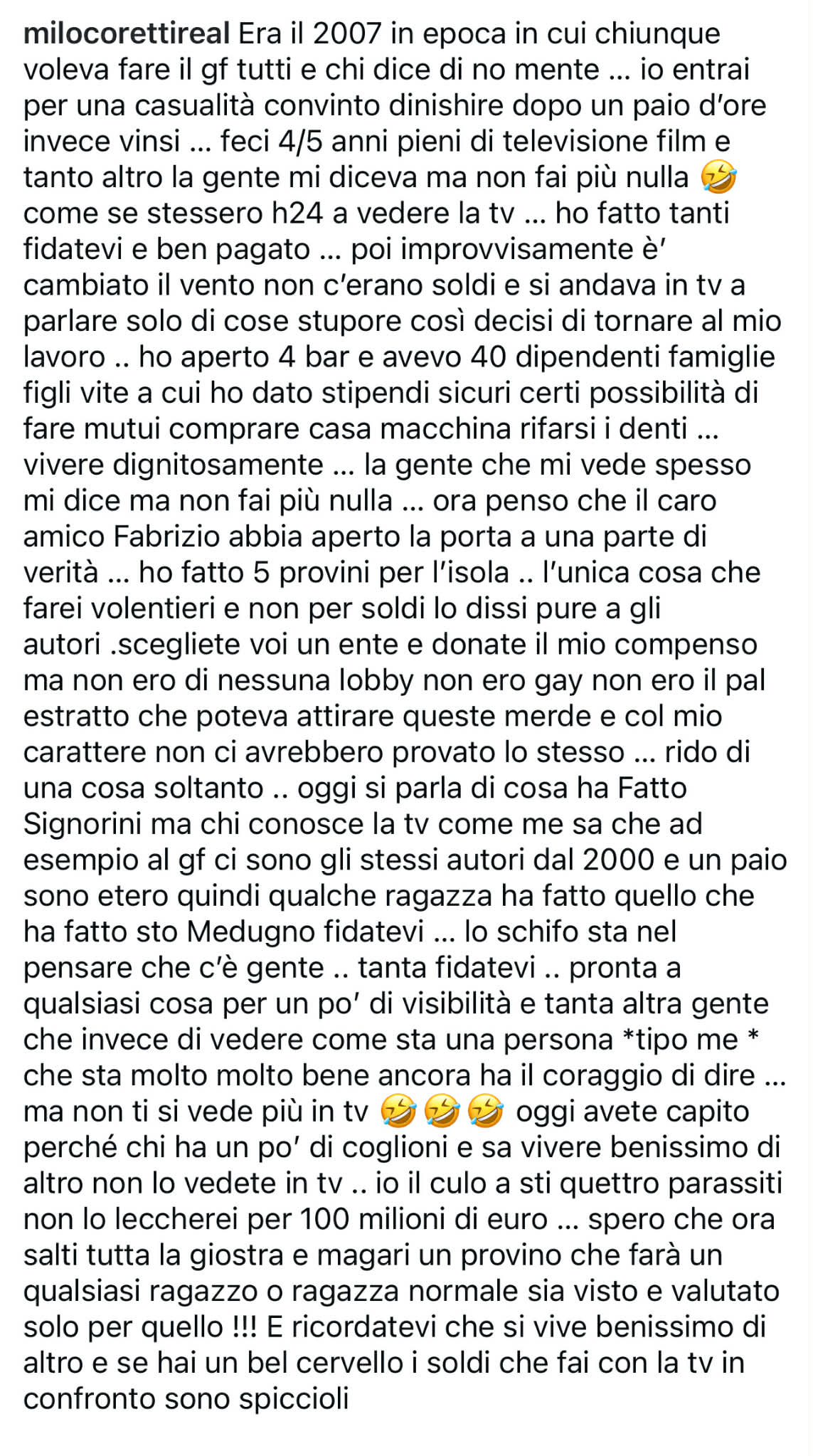 “La gente oggi mi vede e dice ancora: “Non fai più nulla”. Ma io penso che Fabrizio abbia aperto una porta su una parte di verità. Ho fatto cinque provini per L’Isola dei Famosi: l’avrei fatta volentieri, non per soldi (avevo persino detto agli autori di donare il compenso in beneficenza), ma non facevo parte di nessuna lobby, non ero gay, non ero l’estratto “perfetto” per attirare certe dinamiche televisive. E con il mio carattere non ci avrebbero comunque provato. Oggi si parla di quello che ha fatto Signorini, ma chi conosce la tv come me sa che ad esempio al Grande Fratello ci sono gli stessi autori dal 2000 e un paio sono etero quindi qualche ragazza ha fatto quello che ha fatto ‘to Medugno fidatevi. Lo schifo sta nel pensare che c’è gente -tanta fidatevi- pronta a qualsiasi cosa per un po’ di visibilità. E quanta altra che vive bene, come me, viene giudicata solo perché “non si vede più in TV”. Ora forse avete capito che chi ha carattere e dignità, e sa vivere benissimo anche senza televisione, non lo vedete più lì. Io non leccherei il sedere a certi personaggi nemmeno per 100 milioni di euro. Spero che d’ora in poi verranno scelti ragazzi e ragazze normali, valutati per ciò che sono davvero. Ricordatevi questo: si può vivere benissimo anche senza altro. E se hai cervello, i soldi che fai con la TV, in confronto, sono spiccioli”.