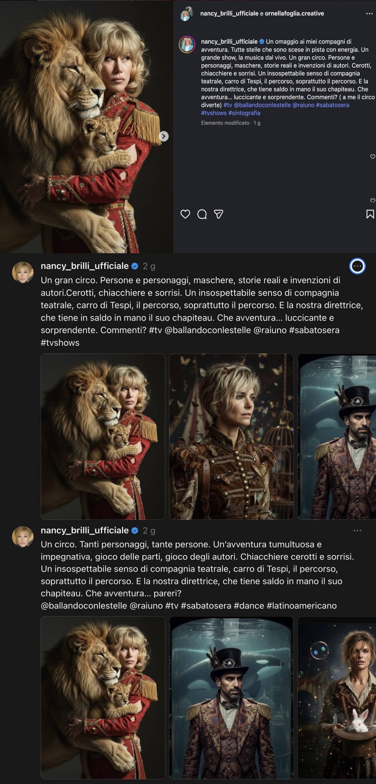 24 ore dopo la sua eliminazione, la concorrente ha pubblicato un carosello su Instagram con diverse foto generate dall’intelligenza artificiale di lei, Milly Carlucci e altri protagonisti di Ballando Con le Stelle 2025 in versione circensi vintage, accompagnato da una didascalia particolare, dove lo show di rai Uno viene paragonato a un bel circo e in cui si parla anche di invenzioni degli autori: “Un omaggio ai miei compagni di avventura. Tutte le stelle che sono scese in pista con energia. Un grande spettacolo, la musica dal vivo. Un gran circo. Persone e personaggi, maschere, storie reali e invenzioni di autori. Cerotti, chiacchiere e sorrisi. Un insospettabile senso di compagnia teatrale, carro di Tespi, il percorso, soprattutto il percorso. E la nostra direttrice, che tiene saldo in mano il suo chapiteau. Che avventura… luccicante e sorprendente. Commenti? (a me il circo divertente)“.
