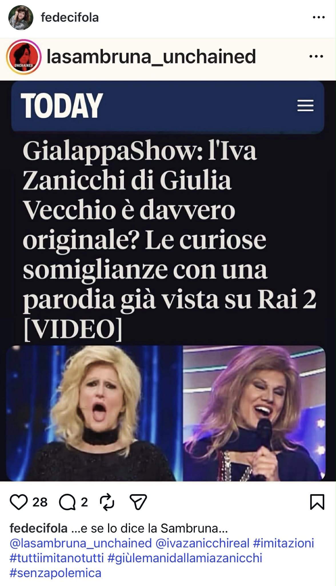 Un pensiero che ha sposato anche quest’ultima che ha condiviso nelle storie di Instagram il video della sua imitazione, mentre nei post l’articolo pubblicato da Grazia Sambruna su Today, scrivendo: “…e se lo dice la Sambruna“, con tanto di hashtag #GiuLeManiDallaMiaZanicchi.